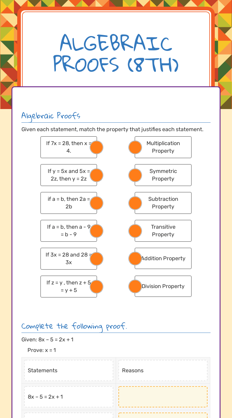 You have solved algebraic equations for a couple years now, but now it is time to justify the steps you have practiced . Later, as learning progresses they link algebraic proof to surds and trigonometry. If 7x = 28, then x = 4. Is called an algebraic proof, the table shows properties you have studied in algebra. Algebraic properties and proofs name. View revision lessondownload presentation and worksheet. Given each statement, match the property that justifies each statement. • raise your hand if you have ever solved an algebraic equation. Swbat review properties of equality & use them to write algebraic proofs. 4x = 12x + 32. This set of classwork and homework assignments will help your . Write a reason for every step. The following properties are true for any real numbers a, b, and c.